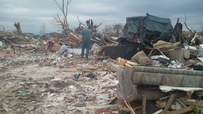 So the Whites grabbed their cellphones, jumped into their car and proceeded to drive out, around and behind the tornado. After it had passed, they returned to a house and neighborhood that had been reduced to rubble; they couldn’t tell where one house ended and another began.